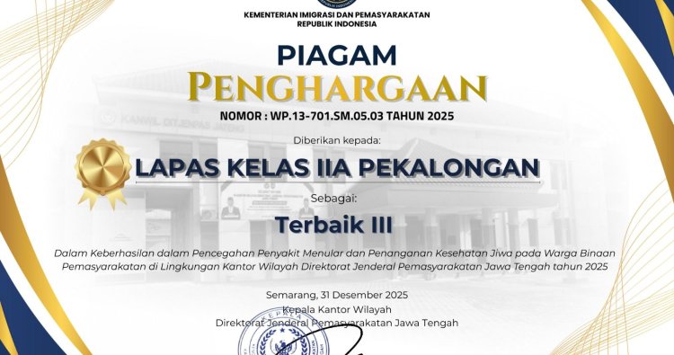 Pada kesempatan tersebut, Lapas Pekalongan juga menerima penghargaan sebagai Terbaik III dalam keberhasilan pencegahan penyakit menular dan penanganan kesehatan jiwa pada Warga Binaan Pemasyarakatan di lingkungan Kantor Wilayah Direktorat Jenderal Pemasyarakatan Jawa Tengah Tahun 2025.